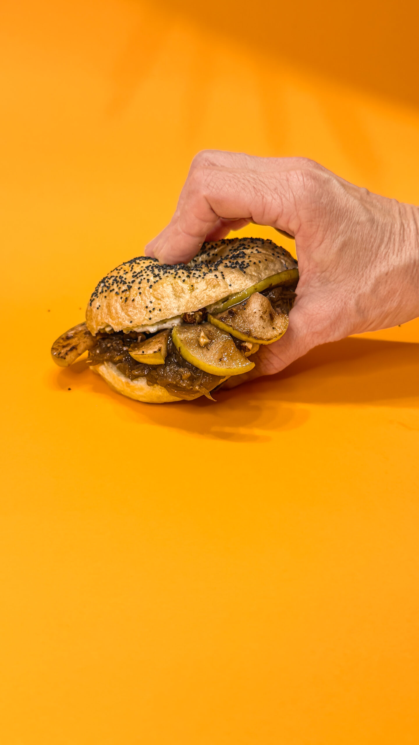 Bagel XL de queso azul con cebolla caramelizada, peras grilladas y garrapiñada de nueces acompañado con bastones de batata con mermelada casera de bacon, cebolla morada caramelizada y ajo asado