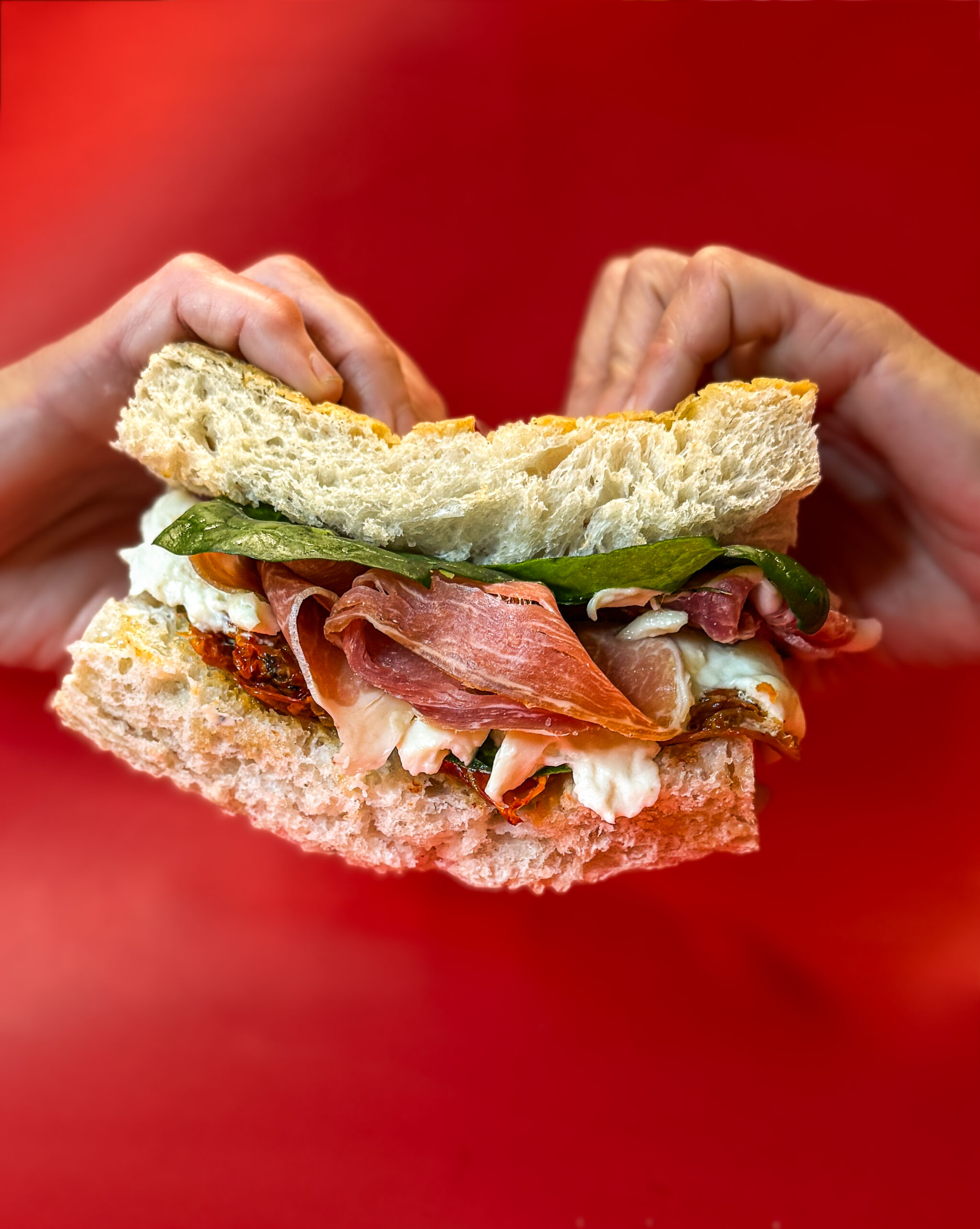 Focaccia de jamón crudo y burrata con hojas frescas de espinaca fresca, tomates secos en aceite de albahaca con papas rústicas, pesto de rúcula y alioli de limón y mostaza antigua
