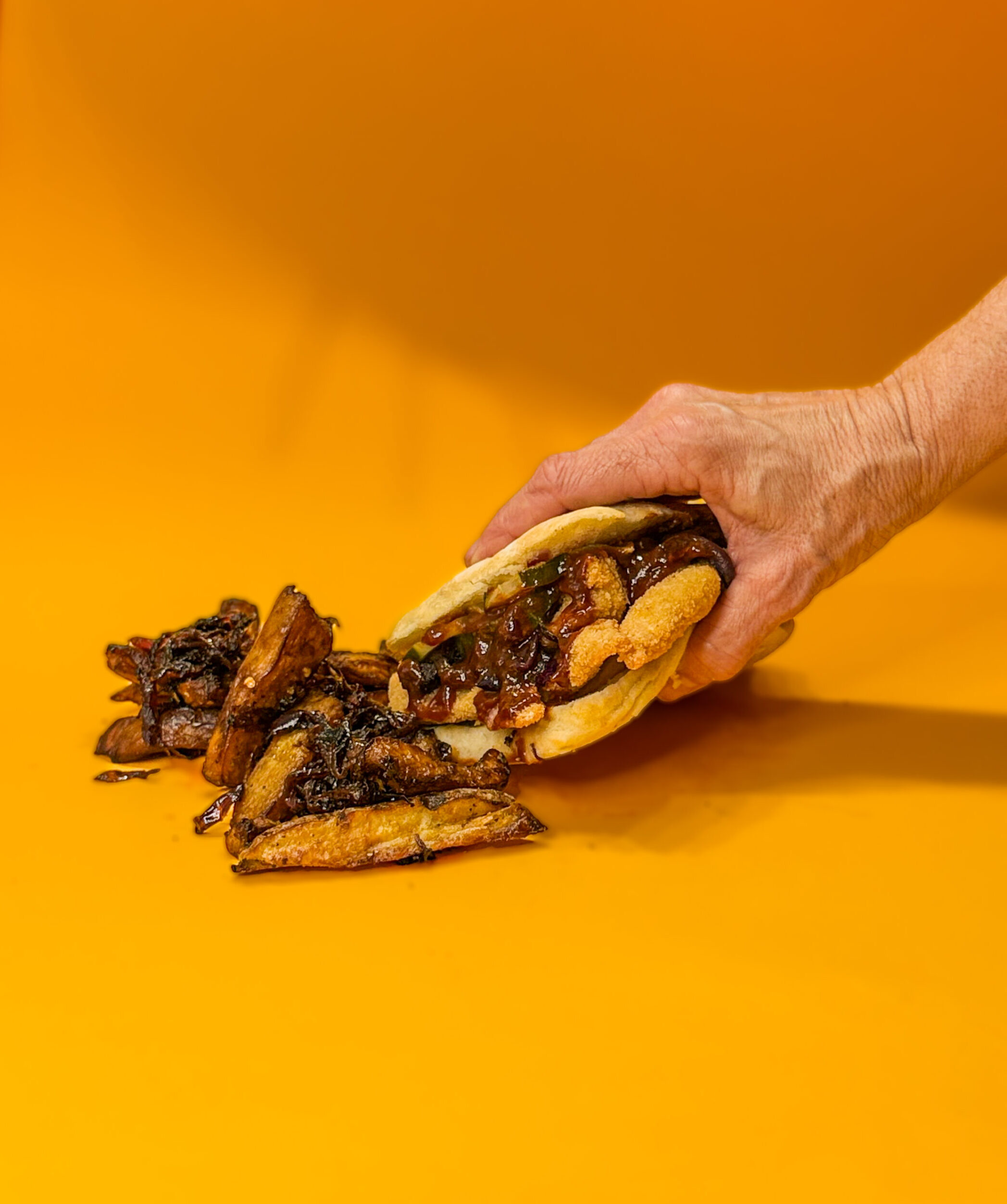 Pan brioche de pollo crispy con pickles de pepino y cebolla morada y emulsión de ají amarillo y guarnición de bastones de batata con mermelada casera de bacon, cebolla morada caramelizada, ajo asado